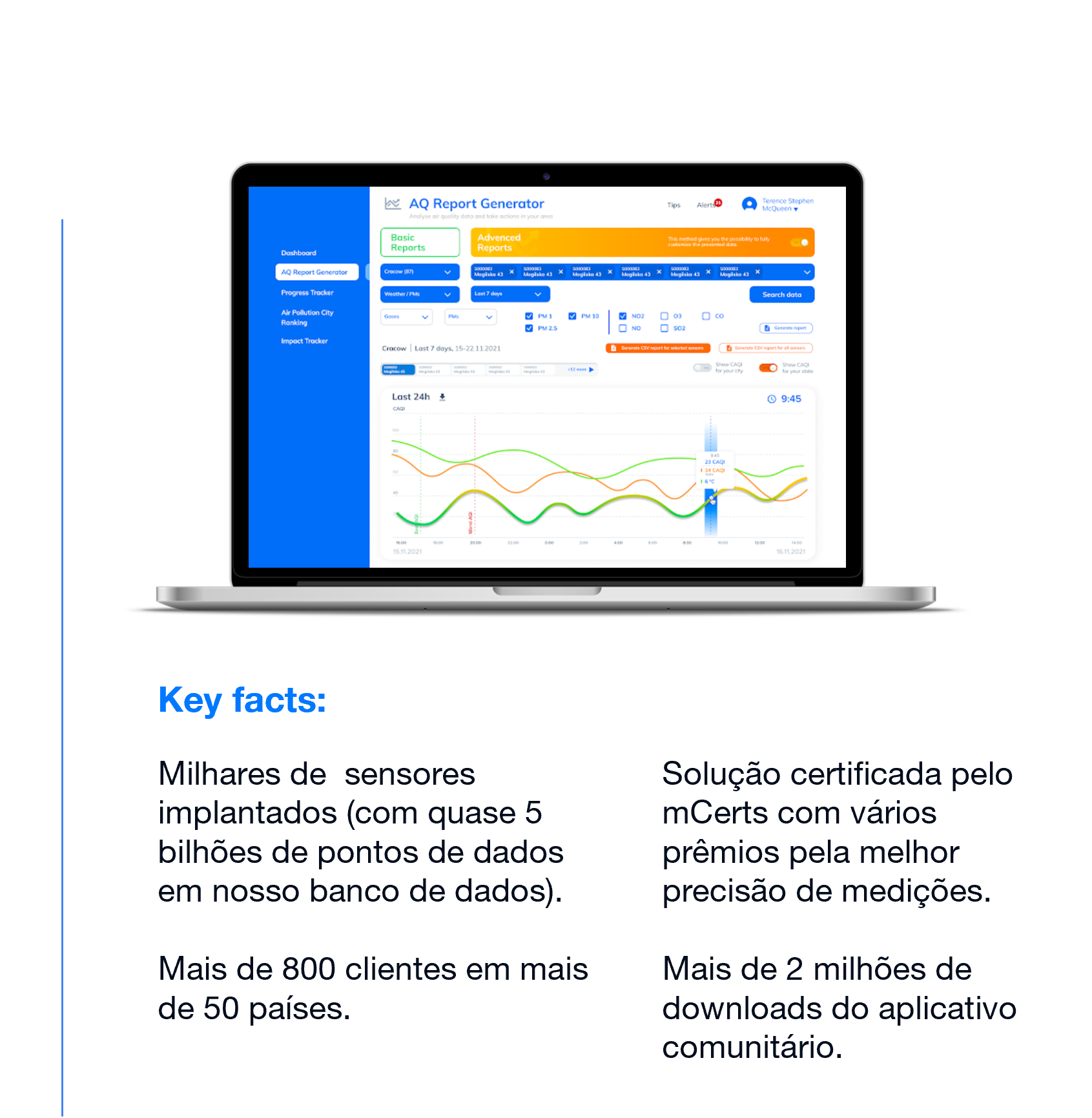●Plataforma de Dados: painel versátil para ambientalistas, urbanistas e operadores de projetos - visualização de dados, gerador de relatórios, engajamento da comunidade (número de cliques nos sensores) e folhas de dados que resumem a qualidade do ar em períodos escolhidos (pronto para publicação).